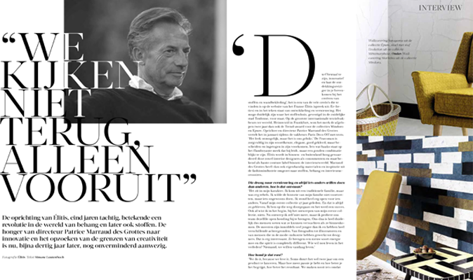 De oprichting van Élitis eind jaren tachtig betekende een ware revolutie in de wereld van behang en later ook interieurstoffen. De drang naar innovatie van directeur Patrice Marraud des Grottes en zijn voortdurende zoektocht naar de grenzen van creativiteit is bijna dertig jaar later nog altijd duidelijk aanwezig.